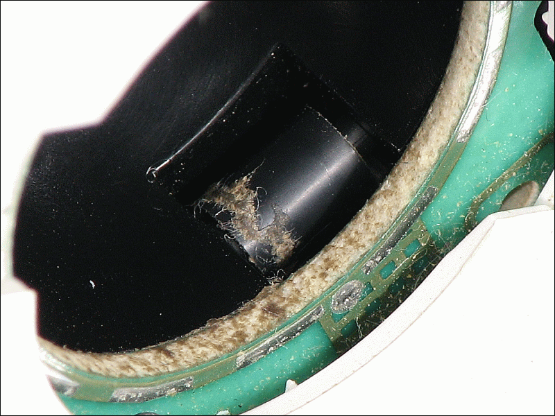 On the ball-type mice, you will eventually have problems with tracking. Assuming that nothing on your desktop has changed, the problem will likely be that the rollers inside the mouse have become contaminated. The rollers transfer motion from the ball to the encoders. When they get dirty, they fail to roll properly and therefore, the encoders will not 'see' the motion properly. Luckily, the problem is easily corrected. What you need to do is remove the ball retaining cover. It typically either slides off or unscrews ~1/4 turn. There should be some sort of arrow on the cover to tell you what to do. When you remove the cover, the ball will be free to fall out (just letting you know so you don't have to bend down and pick it up off of the floor). When you get it open, you will see three rollers. Two of the rollers are active. The third is spring-loaded and is used to keep the ball in contact with the other rollers. All three rollers need to be free of foreign material. If you look at the following picture (a little disgusting, I know), you can see that the black roller has some gray material on it. It's a combination of cloth and paper fibers and oil from the users hands. To clean it, use a dry paper towel and wipe sideways while rolling the roller a little on each pass. It may take quite a few passes to get it clean. When you think it's clean, turn it by hand and make sure that it is actually clean. Do this on all three rollers. When finished, simply replace the ball and the retainer cover.