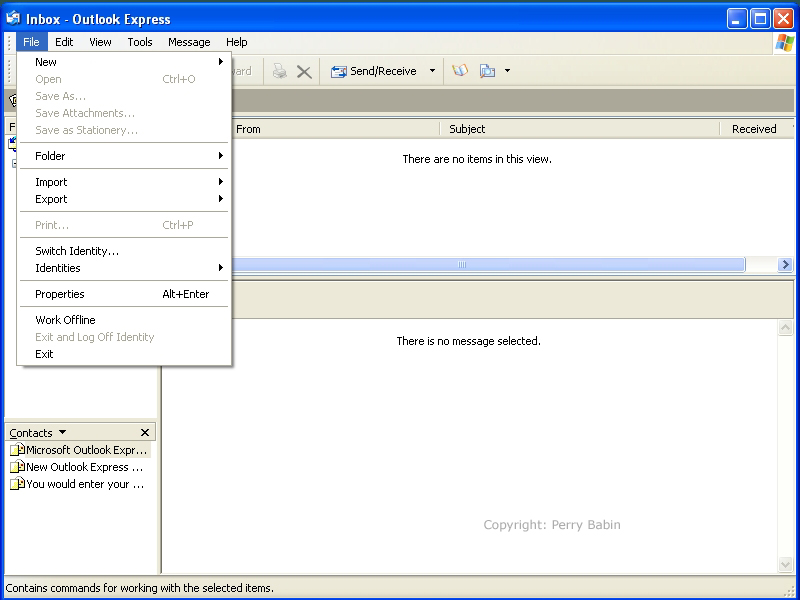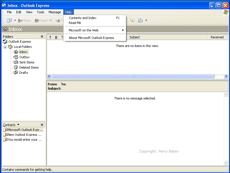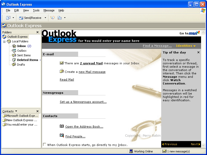 ![]() When you open Outlook Express, you will see a screen similar to this one. If you have unread email, Outlook Express will notify you (as you can see below). Clicking on any of the links on the page will open the respective page. I clicked the message that indicated that I had unread messages.