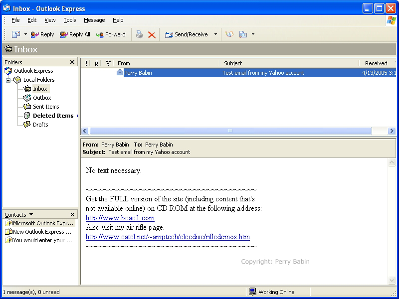 ![]() Below, you can see that I have only one email message. The other was spam and I deleted it. To delete a message, you can right-click the message and select 'delete'. You can see that there is a 'deleted items' folder on the left and that the text is bolder than that of the others. This means that there are unread messages in that folder. To view any message in the 'preview' window (the lower right pane), you simply click on it. If you double-click the message (in the message list), it will open in a larger window. The size of the larger window can be adjusted to fit you tastes. After resizing it, all new windows should come up at the new size when you double-click a message.