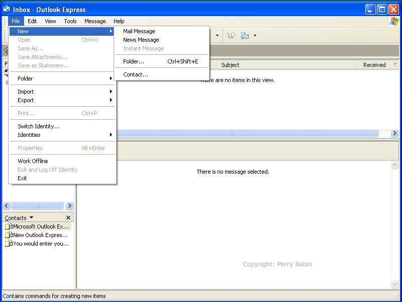 ![]() The 'new' flyout menu allows you to choose to compose a new email or newsgroup message. The other selections are new folder and new contact. If you want to make a new folder, go to FILE >> NEW >> FOLDER and enter the name of the new folder in the appropriate field. Be sure to highlight the folder under which you want the new folder to fall. If you put it under the wrong folder, you can easily move it later by dragging and dropping it into the desired location. If you want to add a new contact to your address book, go to FILE >> NEW >> CONTACT and enter the relevant information into the appropriate fields.