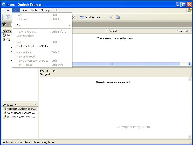 ![]() Below is the 'edit' dialog box. All that is available in this instance is the 'find' and 'Empty Deleted Items Folder'. Most of the other options are self explanatory. The only one that may be confusing is the 'mark as read'unread'. I'll cover that in a few paragraphs.