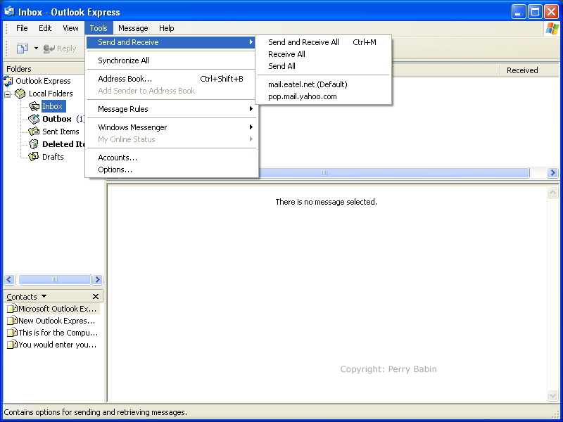 ![]() Here, in the 'send and receive' flyout menu, you can see the three options. The first is 'send and receive all'. When you click this, Outlook Express will retrieve all of your messages from all of your servers and it will send all of the messages in your outbox. Messages will, by default, be sent as soon as you hit the send button. If, however, you choose to send them to the outbox to be sent later, you can do so by UN-checking the 'Send messages immediatley' under TOOLS >> OPTIONS then select the SEND tab.