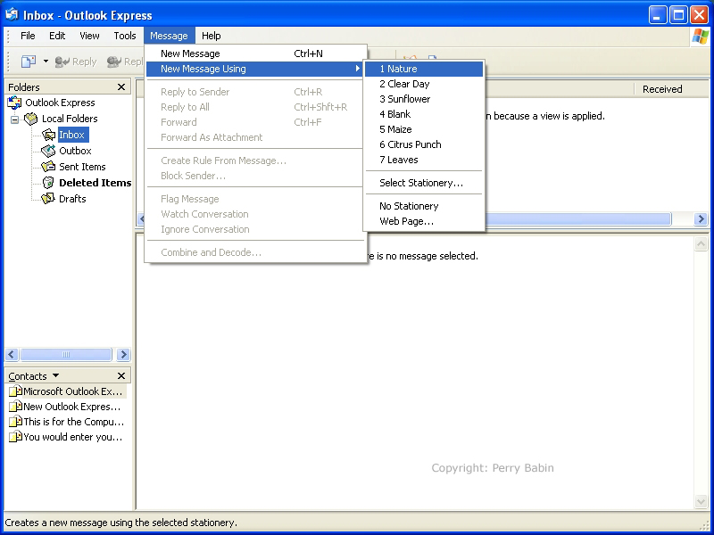 ![]() If you select the 'new message using' option, you will have several formatting choices. While I don't like to see unnecessary things sent in formal email, you may want to use them for personal email. The various choices have fonts and backgrounds pre-selected. If you're sending email to someone who is not a close friend or relative, I'd suggest that you send email with plain text and no graphics.