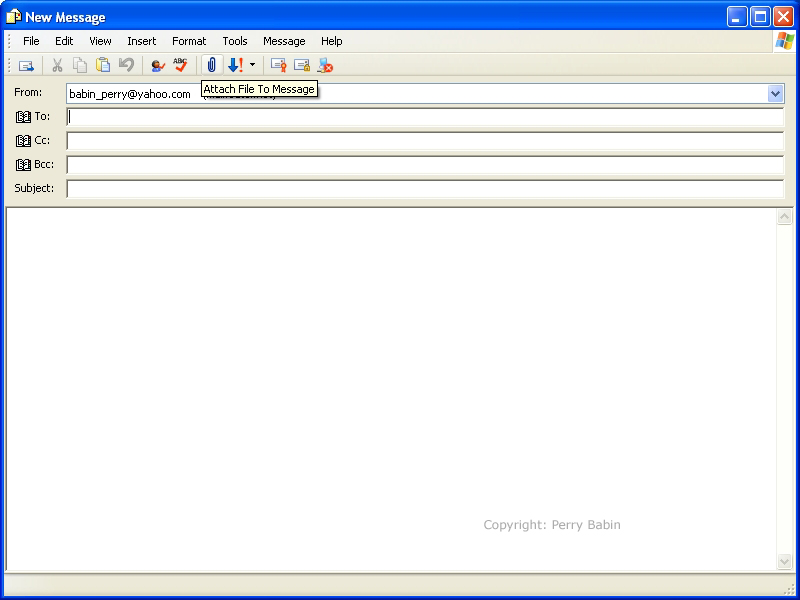 ![]() This is what the 'new message' window will look like when there is an attachment. Of course, your attachment will not have the same name. If you look to the right of the file name, you can see the file size. If you're sending a scanned image, please no... PLEASE make sure the file isn't too large. If it's over 100KB, you should ask the recipient before sending it. The 'Scanning and Printing' page covered file sizes of scanned images.